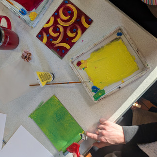 The Parent and Baby Art Hour was designed to create a welcoming environment where parents could engage with art. Amy Hutchings demonstrated hand printing using ink and rollers, a simple technique that allowed everyone to participate, including the tiniest babies. The parents enjoyed the creative process and social interaction with other parents.